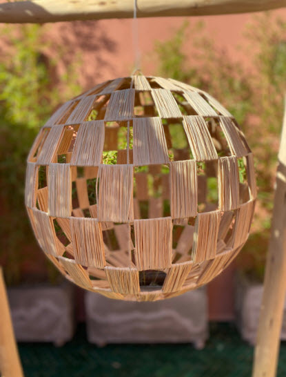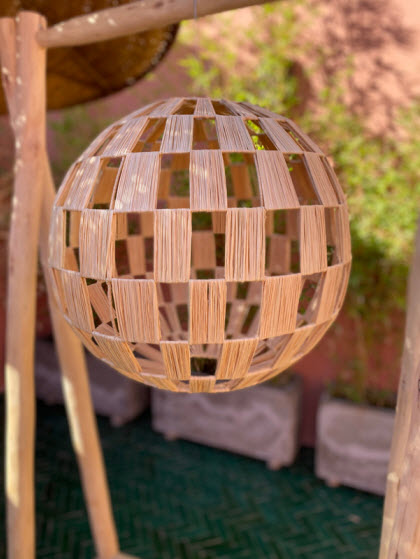Cette suspension en boule damier est une pièce lumineuse et élégante qui apporte une touche d’exotisme et de chaleur à tout intérieur. Sa conception unique combine la légèreté et la flexibilité de la fibre de raphia avec la robustesse et l’élégance du fer  forgé, créant ainsi un équilibre harmonieux entre nature et artisanat.